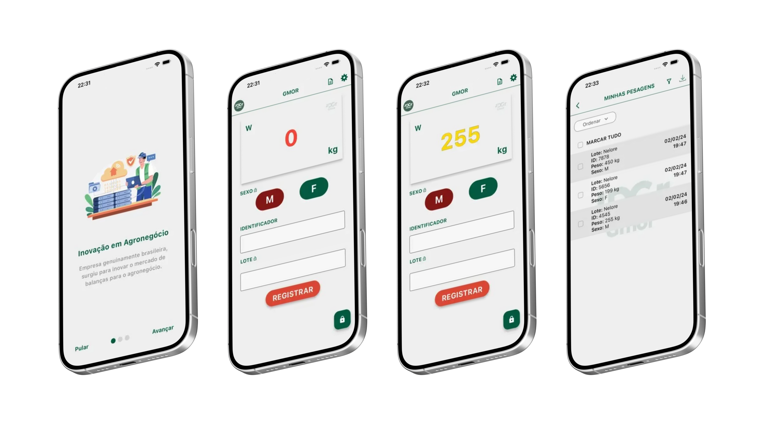 Nosso App conecta-se às balanças da Gmor e exibe, em tempo real, dados como peso do animal, divididos por lotes, registrando por datas e outras informações