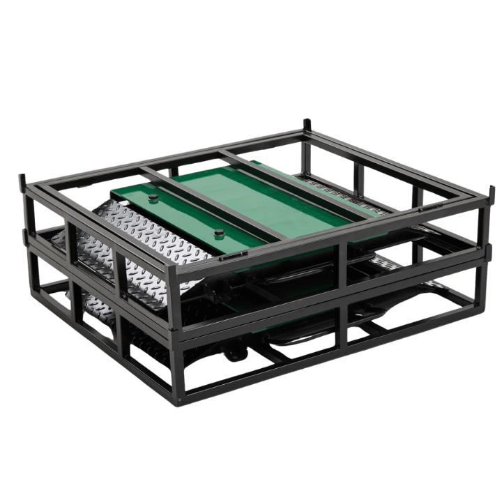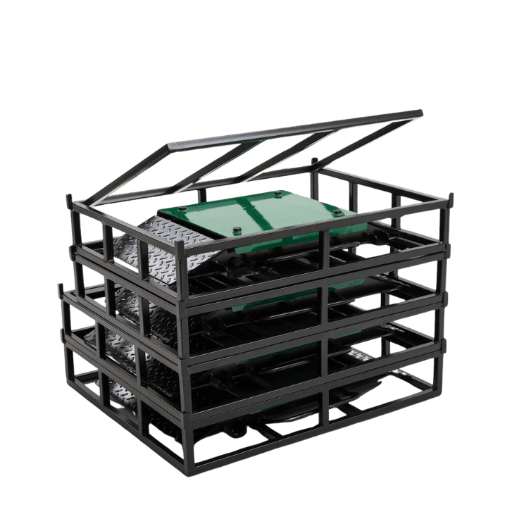 Fabricado em metal leve e resistente, o rack facilita o transporte e a armazenagem das plataformas. Tampa com trava, pontos de amarração, opção de rodízios e design empilhável para otimizar espaço.